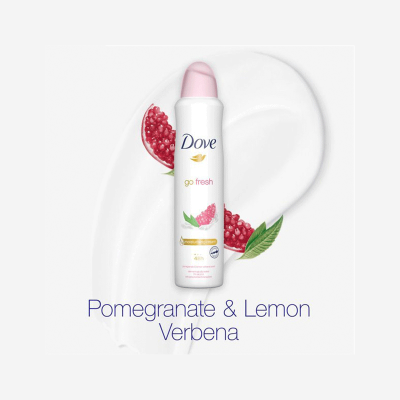 اسپری ضد تعریق زنانه Dove مدل Go Fresh با رایحه انار و برگ لیمو، ترکیبی از عملکرد ضد تعریق، رایحهای نشاطآور و مراقبت از پوست را در یک محصول ارائه میدهد. این اسپری با فرمولاسیون حاوی ¼ کرم مرطوبکننده، تا ۴۸ ساعت از تعریق و بوی بدن جلوگیری کرده و در عین حال از خشکی و تیرگی پوست زیر بغل پیشگیری میکند. رایحه انار و برگ لیمو حس طراوت و انرژی را در طول روز حفظ میکند.